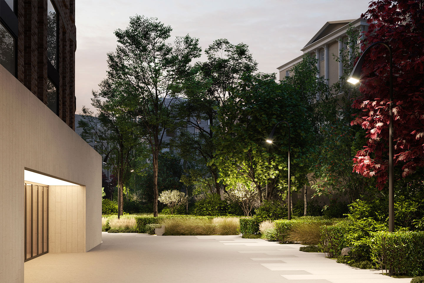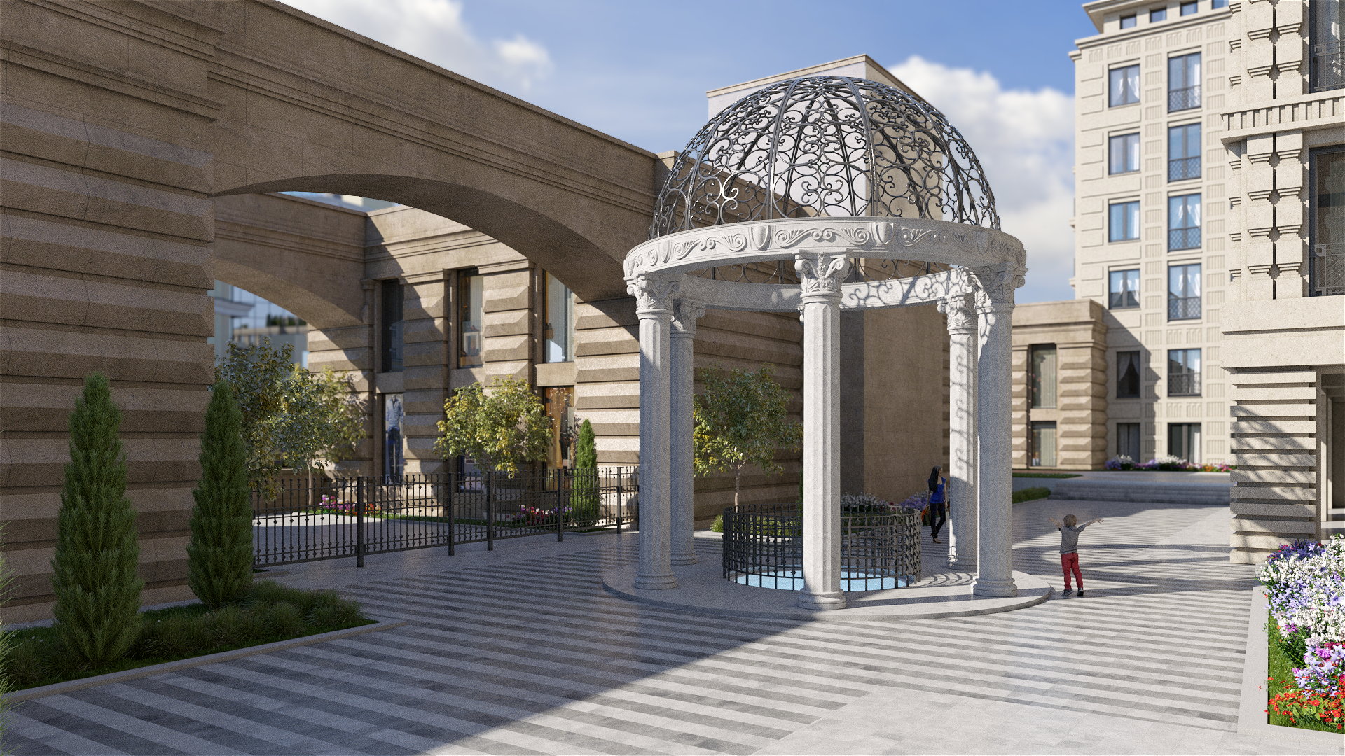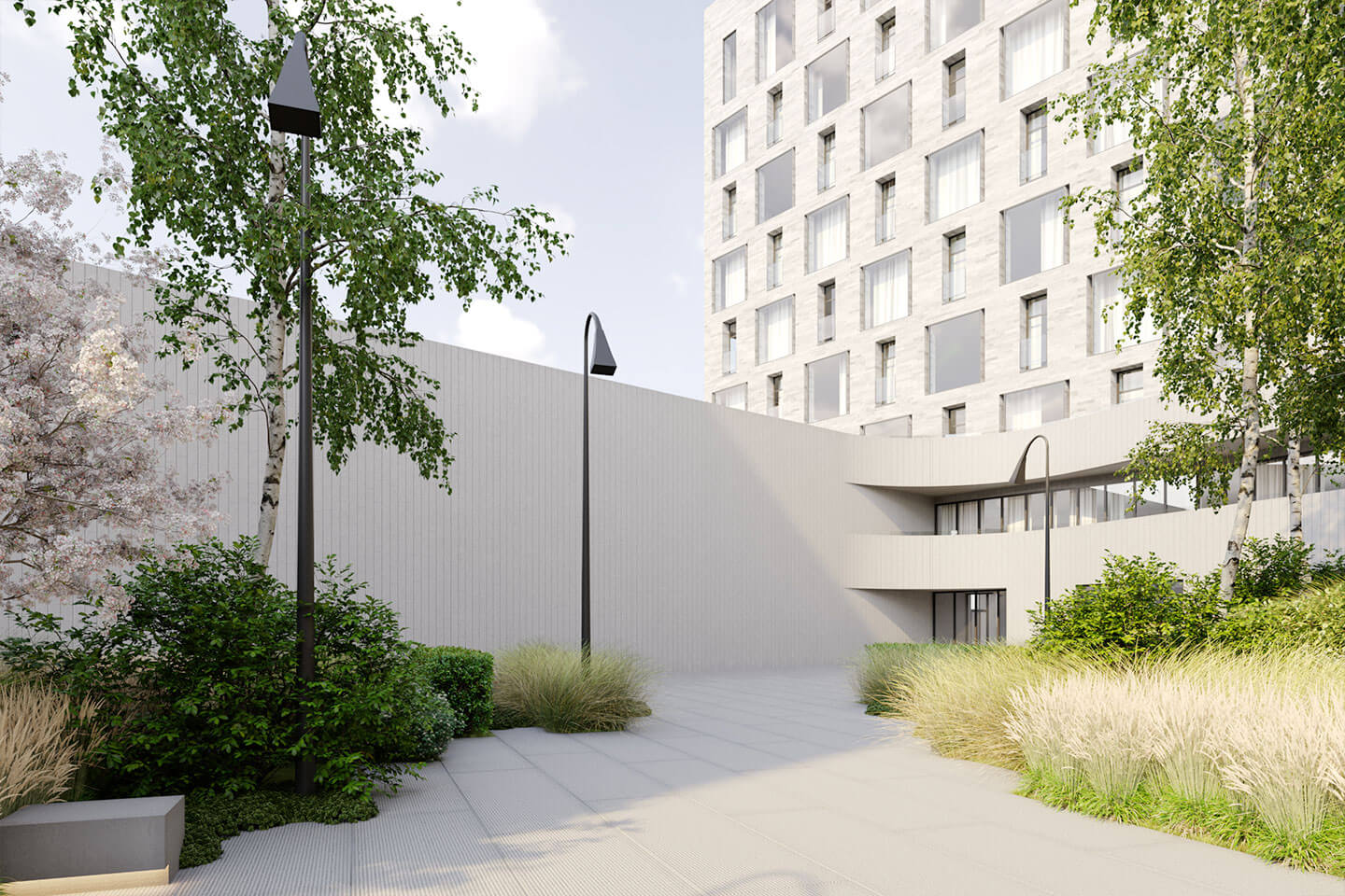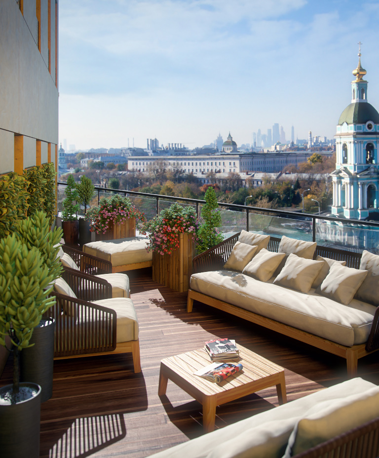- уютный собственный двор с благоустроенными лаунж-зонами и лёгким урбанистическим ландшафтом
