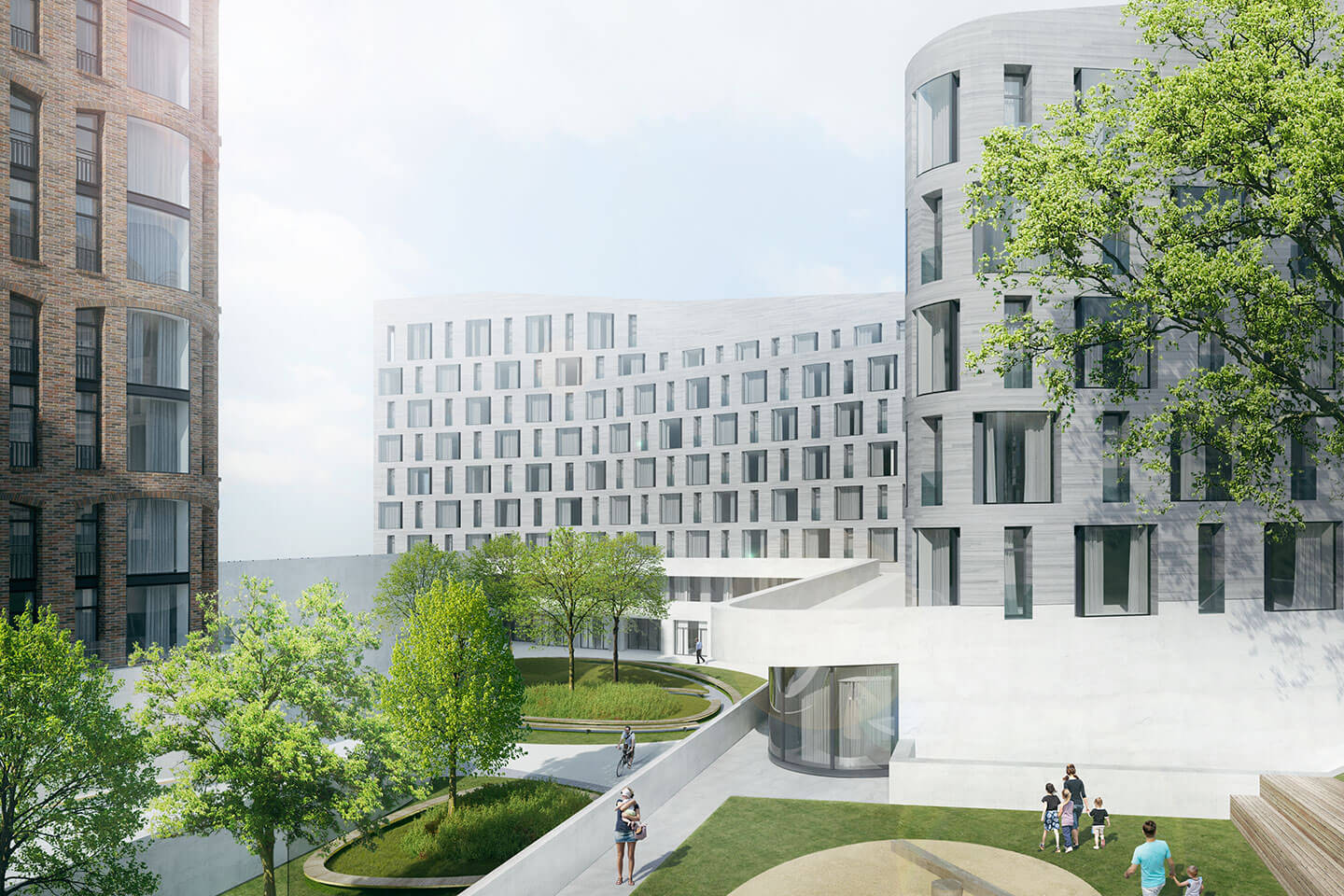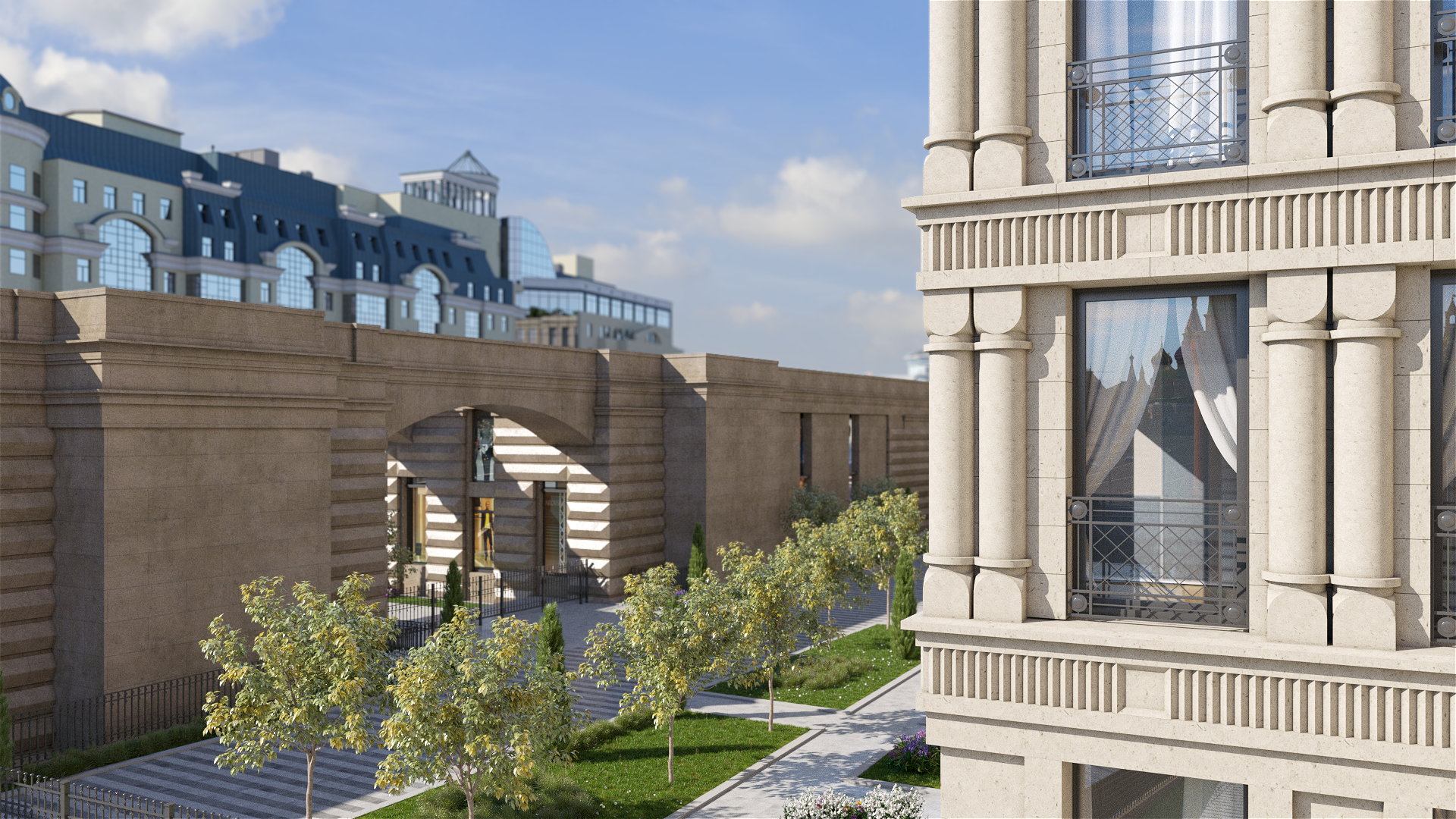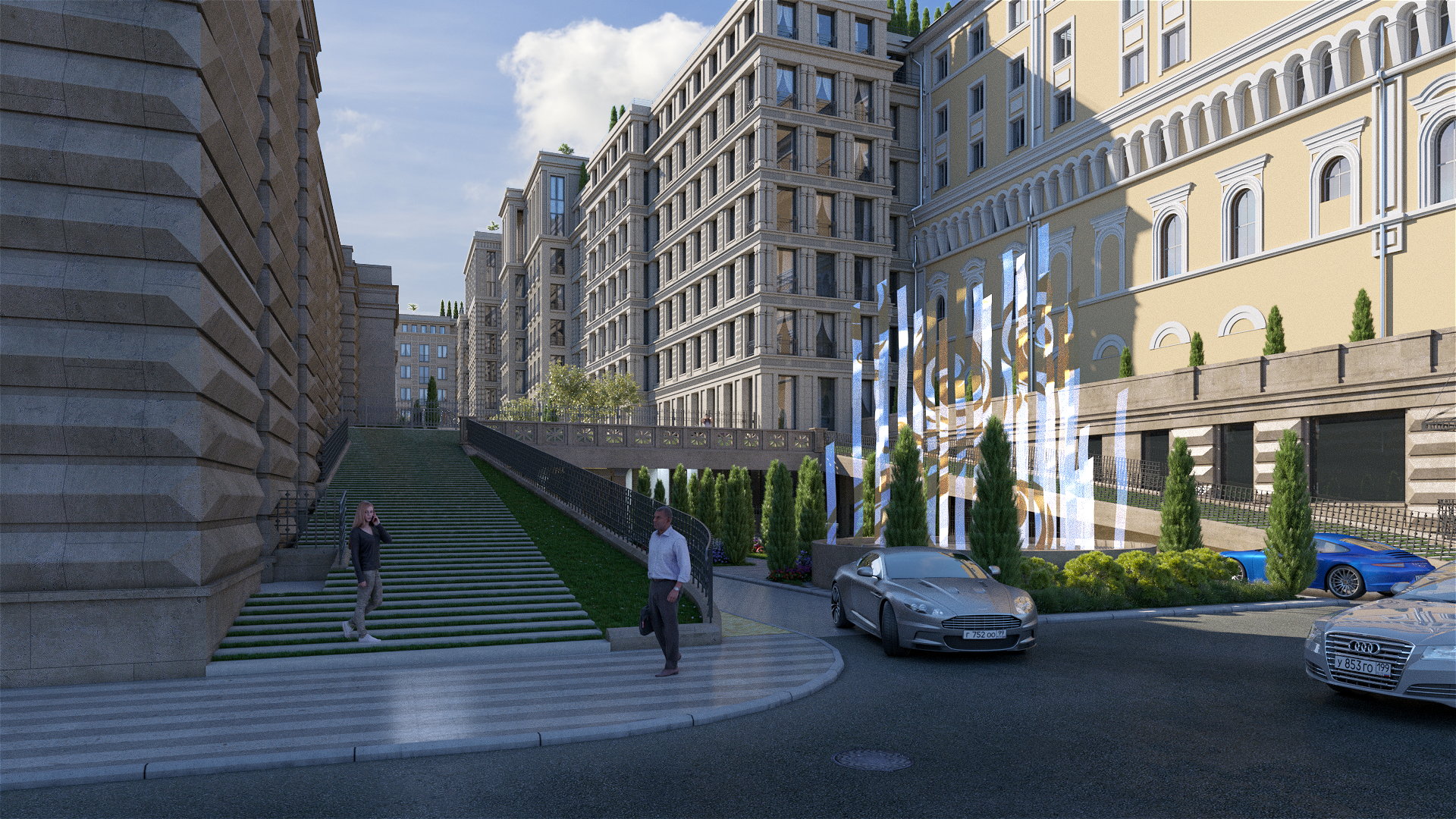 - уютный собственный двор с благоустроенными лаунж-зонами и лёгким урбанистическим ландшафтом